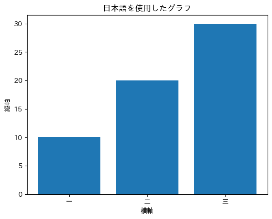 plt.bar()を使って棒グラフを作成し、plt.title()やplt.xlabel()などを使い、日本語でタイトルや軸の名前を設定しています。 - グラフの表示(13行目): 最後に